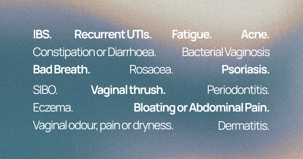 Microbiome-focused care goes beyond symptom management—it addresses the underlying dysbiosis driving common conditions seen in everyday practice. With structured microbiome testing and treatment programs, GPs can support patients struggling with IBS, bloating, constipation, diarrhoea, reflux, recurrent UTIs, bacterial vaginosis, thrush, acne, rosacea, eczema, gum disease, bad breath, and even mood-related disorders linked to the gut-brain axis. These are conditions patients are desperate to solve—and now you can offer them evidence-based, doctor-led solutions.