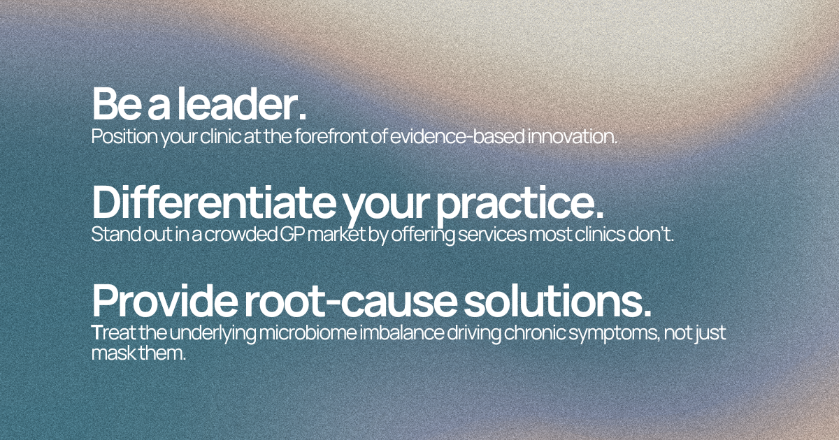 Patients are searching for answers that traditional care often overlooks. IBS, recurrent UTIs, acne, oral disease, mental health concerns—so many of these have a microbiome root cause. By introducing microbiome testing and structured treatment programs, you can provide a science-backed, doctor-led solution that not only improves patient outcomes but also differentiates your clinic in a crowded market.